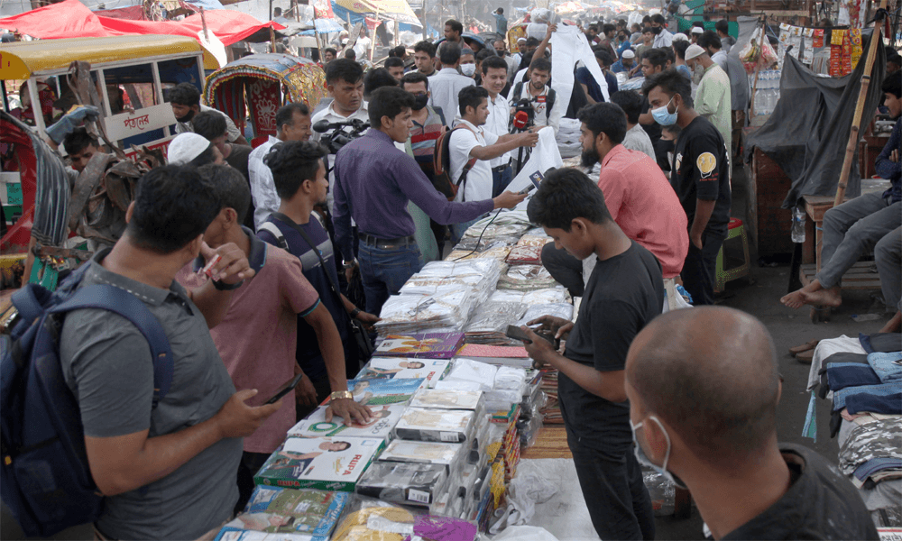 ঢাকার তাপমাত্রা শুক্রবার এমনিতেই ৪০ ডিগ্রি সেলসিয়াস ছাড়িয়ে গেছে। বঙ্গবাজার এলাকায় গরম যেন আরেকটু বেশিই অনুভূত হল। এর সঙ্গে রয়েছে ঝাঁঝালো পোড়া গন্ধ।