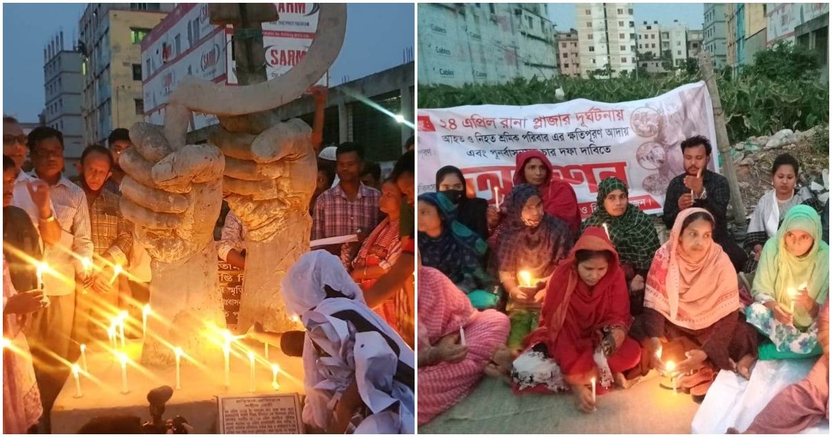 ঢাকার সাভারে রানা প্লাজা ধসের দশম বার্ষিকীর প্রাক্কালে মোমবাতি জ্বালিয়ে নিহত শ্রমিকদের স্মরণ করেছেন স্বজন ও বিভিন্ন শ্রমিক সংগঠনের নেতা-কর্মীরা।