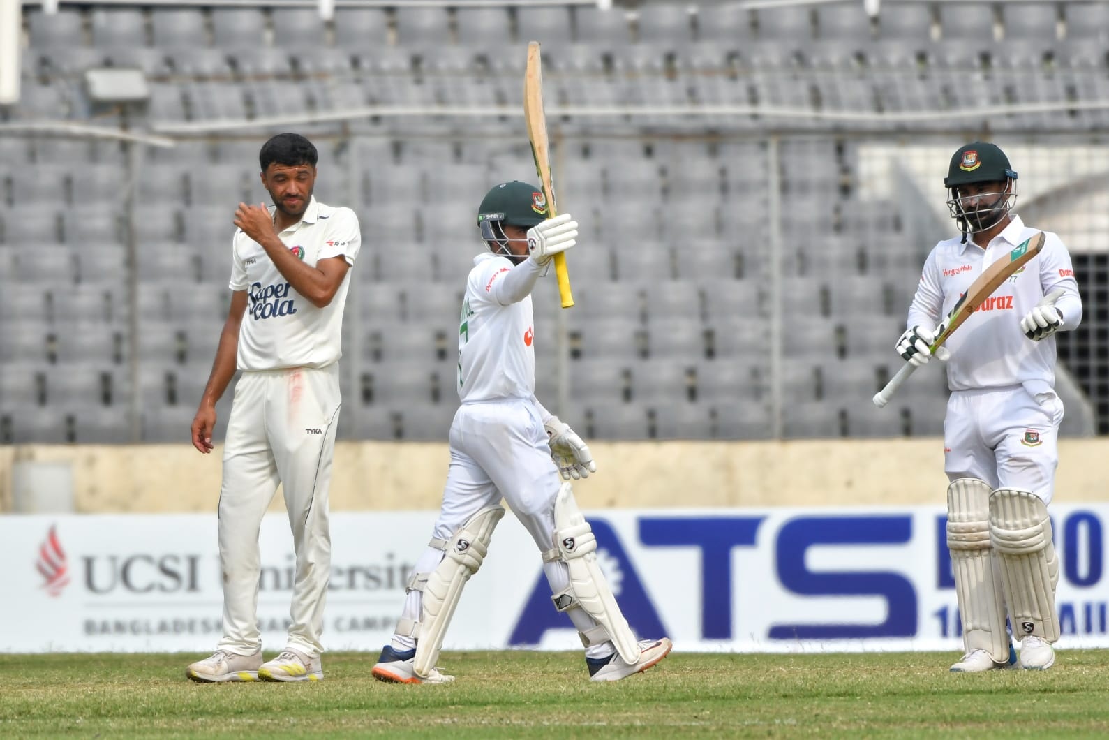 দ্বিতীয় দিন শেষ বিকেলেই বাংলাদেশের লিড দাঁড়িয়ে যায় ছিল ৩৭০ রান। ১ উইকেট হারিয়ে ১৩৪ রান নিয়ে দিন শেষ করে টাইগাররা। তৃতীয় দিন সকালে ব্যাট করতে নেমে আগের দিনের দৃঢ়তাই দেখাচ্ছেন শান্ত এবং জাকির। দু’জনের ব্যাটে চড়েই লিড পার হয়ে গেছে ৪০০ রান।এ রিপোর্ট লেখার সময় বাংলাদেশের রান ৩২ ওভারে ১ উইকেট হারিয়ে ১৮১। ৮৩ রানে নাজমুল হোসেন শান্ত এবং ৭০ রানে ব্যাট করছেন জাকির হাসান। মোট লিড দাঁড়িয়েছে ৪১৭ রানের।