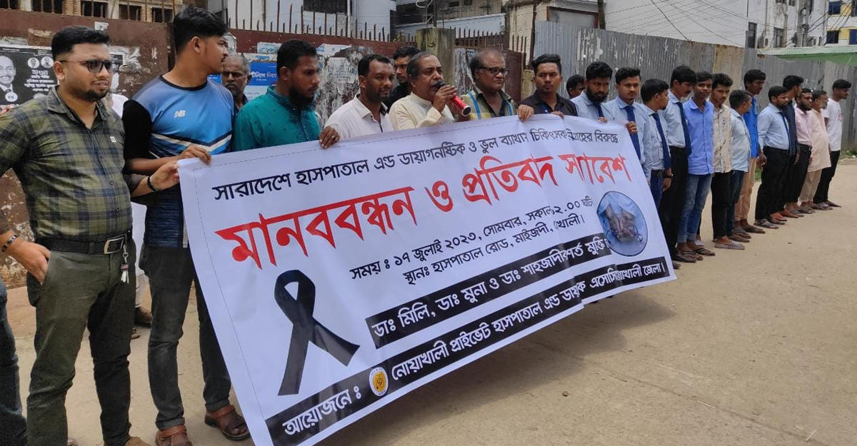 সোমবার (১৭ জুলাই) দুপুরে ২৫০ শয্যা বিশিষ্ট নোয়াখালী জেনারেল হাসপাতালের সামনে এ মানববন্ধন ও প্রতিবাদ সমাবেশ অনুষ্ঠিত হয়। প্রতিবাদ সমাবেশে বিনা তদন্তে চিকিৎসক গ্রেফতার ও নিগ্রহের প্রতিবাদ জানানো হয়।