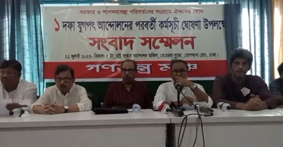 অন্যদিকে গণতন্ত্র মঞ্চের পক্ষ থেকে তোপখানা রোডে সংবাদ সম্মেলন করে কর্মসূচি ঘোষণা করা হয়েছে। নাগরিক ঐক্যের আহ্বায়ক মাহমুদুর রহমান মান্না এ সম্পর্কে বলেন, আমরা আগামী ২৭ জুলাই ঢাকায় সমাবেশের ঘোষণা দিয়েছি।