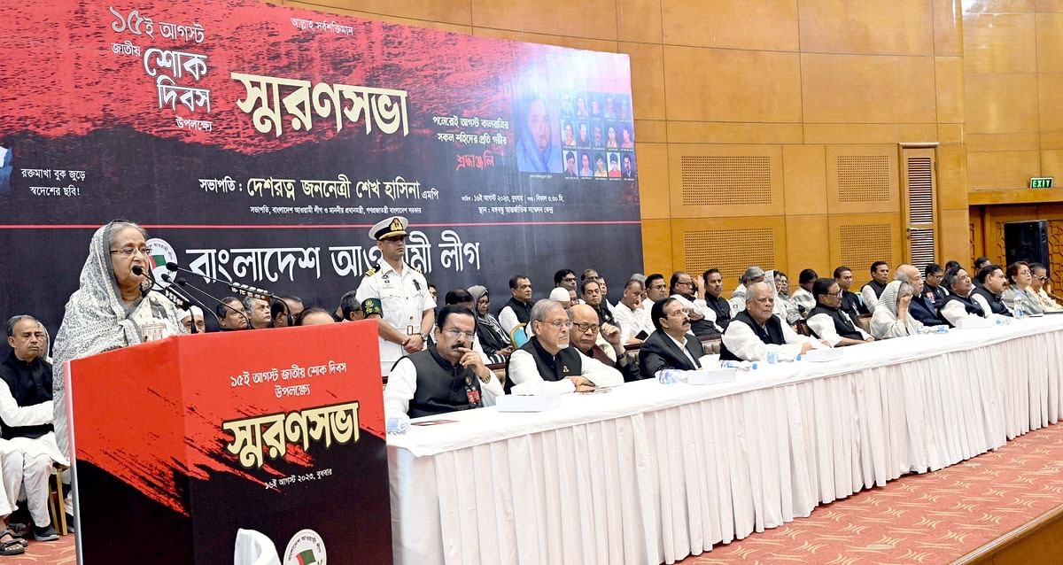 আমরা ভাবতেও পারিনি আমাদের জীবনে এমন একটা আঘাত অপেক্ষা করছে। ১৩ তারিখে আব্বার সঙ্গে, মায়ের সঙ্গে, সবার সঙ্গে কথা হয়। ১৫ তারিখে এ ঘটনা ঘটার পর যখন আমরা জানতে পারি, তখন সব তথ্য আমরা জানতে পারিনি। শেখ হাসিনা বলেন, আমার আপনজন হারিয়েছি, স্বজন হারিয়েছি, বিদেশে রিফিউজি হিসেবে থাকতে হয়েছে। আমরা যারা আপনজন হারিয়েছি, আমারও তো সবচেয়ে বড় প্রশ্ন বাংলাদেশে কী হারিয়েছিল? বাংলাদেশের মানুষ কী হারিয়েছিল? তিনি বলেন, খুনিরা বঙ্গবন্ধুর হত্যার সঙ্গে বাংলাদেশের নাম পরিবর্তন করে ফেলে। ইসলামী প্রজাতন্ত্রের রাষ্ট্র হিসেবে ঘোষণা দেয়। বাংলাদেশ বেতারের নাম পরিবর্তন করে রেডিও বাংলাদেশ করে। জয়বাংলা সেøাগান বাদ দিয়ে জিন্দাবাদ সেøাগান নিয়ে আসে। ইতিহাসই বিকৃতি করে। বাংলাদেশের মানুষের উন্নতির সব স্বপ্ন বন্ধ হয়ে যায়। খুনি মুশ্তাক নিজেকে প্রেসিডেন্ট ঘোষণা করলো, জিয়াকে সেনাপ্রাধান বানালো। জিয়াউর রহমান এ হত্যাকাণ্ডের সঙ্গে ওতপ্রোতভাবে জড়িত। মীর জাফর যেমন তিন মাসের বেশি থাকতে পারেনি। তেমনি মুশ্তাকও থাকতে পারেনি।