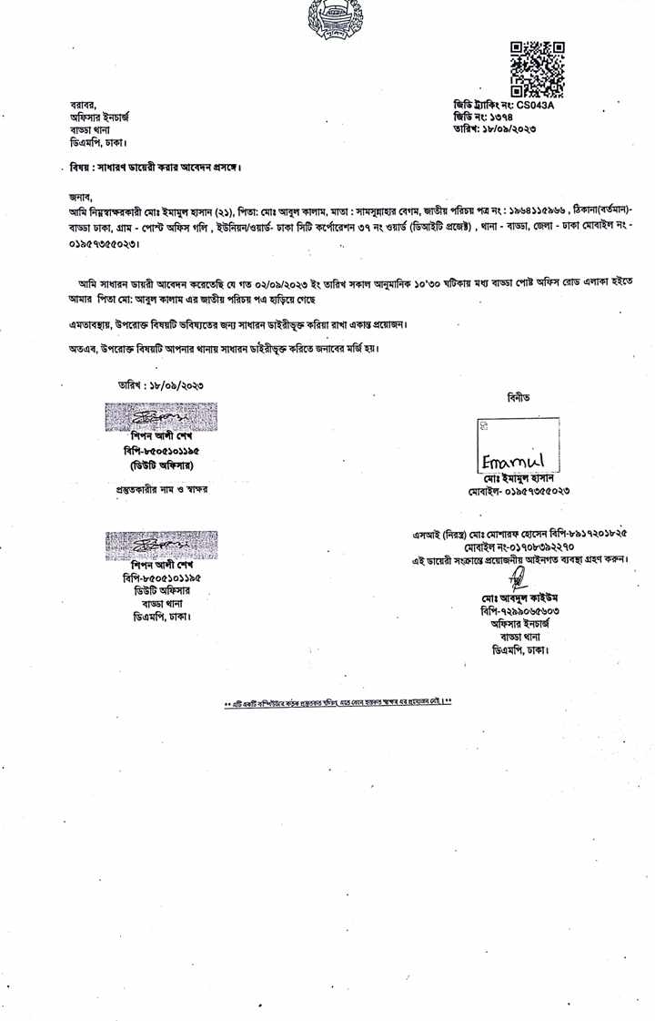 আমি মো: ইমামুল হাসান (২১) পিতা মো: আবুল কালাম মাতা সামসুন্নাহার জাতীয় পরিচয় পত্র নং ১৯৬৪১১৫৯৬৬। মধ্য বাড্ডা পোস্ট অফিস গলি।ঢাকা সিটি কর্পোরেশন।