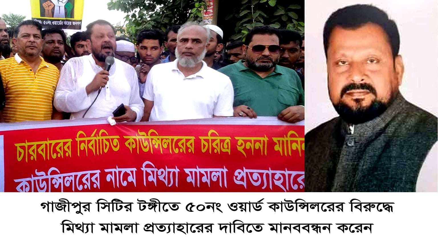 গাজীপুর জেলা প্রতিনিধি:-গাজীপুর সিটির টঙ্গীতে ৫০নং ওয়ার্ড কাউন্সিলরের বিরুদ্ধে মিথ্যা মামলা প্রত্যাহারের দাবিতে মানববন্ধন করেন।