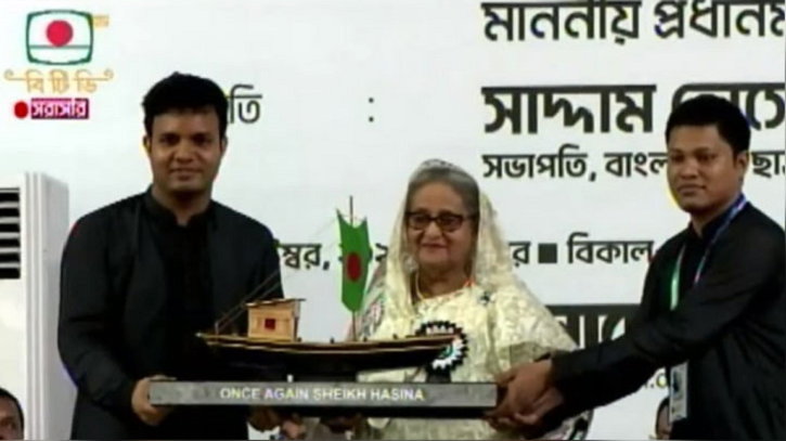 ছাত্রলীগের অভিভাবক শেখ হাসিনাকে ব্যাচ পরিয়ে দেন সংগঠনটির চার নারী নেত্রী।
