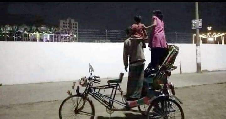 “একজন রিকশাচালক বাবা ছোট মেয়েকে কাঁধে নিয়ে রিকশার পাদানিতে দাঁড়িয়ে আছেন। বড় মেয়ে রিকশার সিটে দাঁড়িয়ে। রিকশাচালক বাবা দুই মেয়েকে এভাবেই শিশুপার্কের বিভিন্ন রাইড দেখাচ্ছেন।