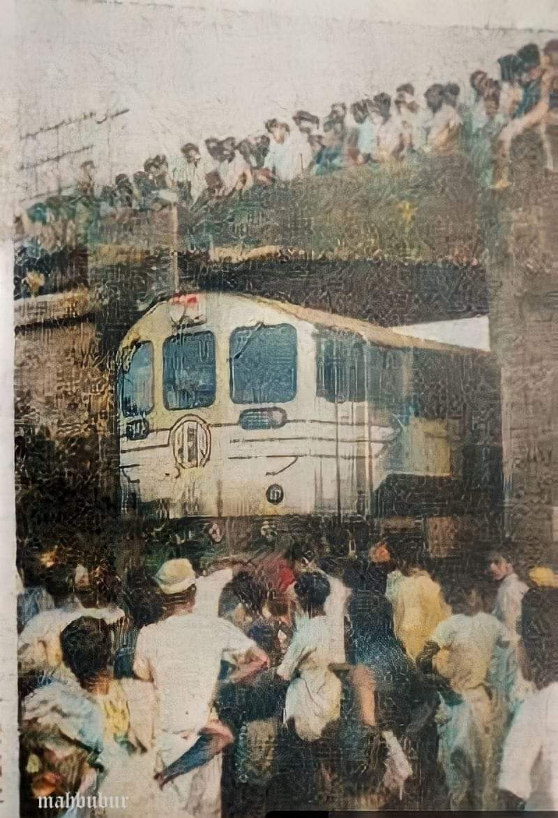“A Dacca-bound train stops under the Hatir Pool Ele-phant Road bridge at 6 a.m. en Sept. 20-OBSERVER”