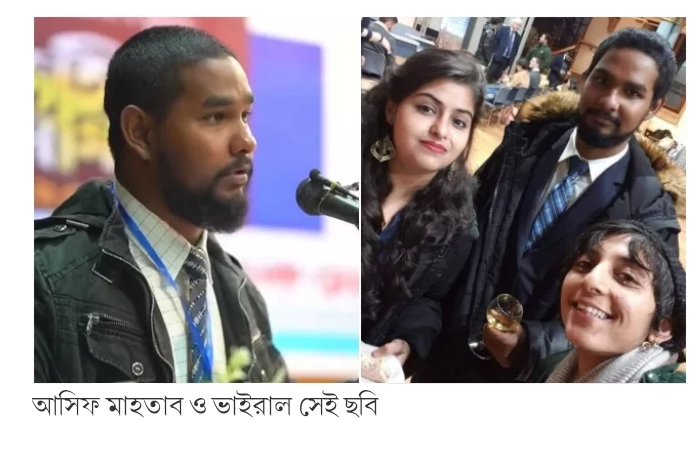 একটি ছবিতে দেখা যায়, আসিফ মাহতাব হাতে মদের গ্লাস নিয়ে দুজন নারীর সঙ্গে হাস্যোজ্জ্বল ভঙ্গিতে দাঁড়িয়ে আছেন। এই ছবিটিই যেন আগুনে ঘি ঢেলে দিয়েছে।