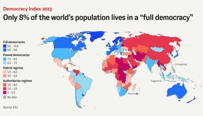 বৃহস্পতিবার(১৫ ফেব্রুয়ারি) যুক্তরাজ্যের লন্ডনভিত্তিক দ্য ইকোনমিস্ট সাময়িকীর ইকোনমিস্ট ইন্টেলিজেন্স ইউনিটের প্রকাশিত ডেমোক্রেসি ইনডেক্স ২০২৩ এ এমনটিই বলা হয়েছে।