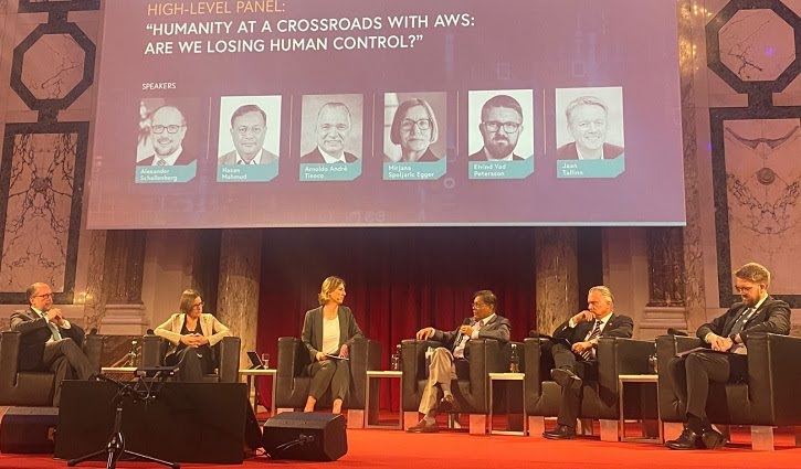 সোমবার (২৯ এপ্রিল) ভিয়েনার হফবার্গ প্রাসাদে `হিউম্যানিটি অ্যাট দ্য ক্রসরোডস: অটোনোমাস উইপনস সিস্টেমস অ্যান্ড দ্য চ্যালেঞ্জ অব রেগুলেশন` শীর্ষক আন্তর্জাতিক সম্মেলনে স্বয়ংক্রিয় অস্ত্র ব্যবস্থা নিয়ন্ত্রণের চ্যালেঞ্জ বিষয়ে উচ্চ-পর্যায়ের প্যানেল আলোচনায় তিনি এ আহ্বান জানান।