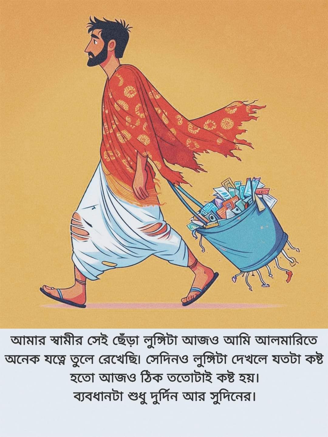 আমার স্বামীর সেই ছেঁড়া লুঙ্গিটা আজও আমি আলমারিতে অনেক যত্নে তুলে রেখেছি৷ সেদিনও লুঙ্গিটা দেখলে যতটা কষ্ট হতো আজও ঠিক ততোটাই কষ্ট হয়।