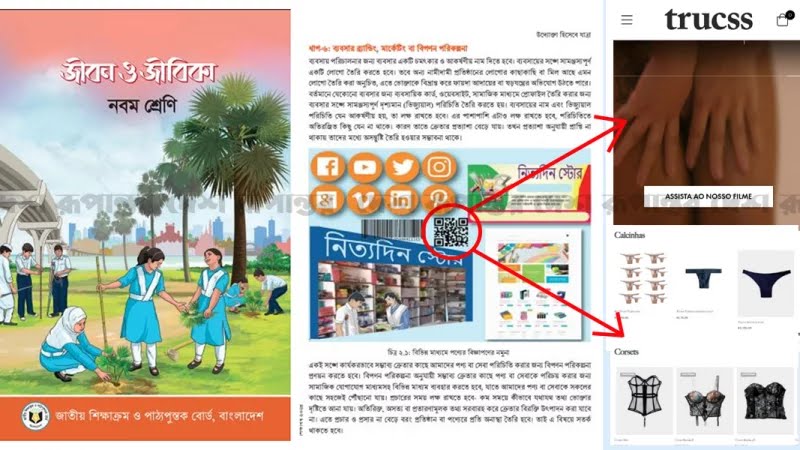 দেশে স্কুলের পাঠ্য বই নিয়ে কয়েকবছর ধরে বিভিন্ন শ্রেণির বইয়ে ভুলসহ বিভিন্ন বিষয় ধরা পড়ছে, যা নিয়ে সমালোচনার শেষ নেই। এবার নবম শ্রেণির ‘জীবন ও জীবিকা’ বইয়ে অন্তর্বাস বিক্রির ওয়েবসাইটের ঠিকানাযুক্ত কিউআর কোড সংযুক্ত থাকায় বিষয়টি নিয়ে সমালোচনা শুরু হয়েছে।বইটির ৩৮ নম্বর পেজে দেখা গেছে, ‘ধাপ-৬: ব্যবসার ব্র্যান্ডিং, মার্কেটিং বা বিপণন পরিকল্পনা’ শিরোনামে উদ্যোক্তা হিসেবে কীভাবে ব্যবসা শুরু করতে হয় সেটি উল্লেখ করা হয়েছে। ওই পেজের ‘চিত্র ২.১: বিভিন্ন মাধ্যমে পণ্যের বিজ্ঞাপনের নমুনার চিত্র তুলে ধরে সেখানে নিত্যদিন স্টোরের একটি ছবি দেওয়া হয়েছে। একই সঙ্গে বিভিন্ন সামাজিক যোগাযোগ মাধ্যমের আইকন দেওয়া হয়েছে। তবে এগুলোর মাঝে একটি কিউআর কোড সংযুক্ত করা হয়েছে। কোডটি স্ক্যান করলে ট্রাক্স (Trucss) নামক পর্তুগিজ একটি নারীদের অন্তর্বাস বিক্রির ওয়েবসাইটে নিয়ে যাচ্ছে। যেখানে এডাল্ট নারী মডেলরা অন্তর্বাস পরে সেটা বিক্রির জন্য বিজ্ঞাপন দেখানো হচ্ছে।
