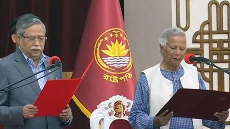 শান্তিতে নোবেলজয়ী প্রফেসর ড. মুহাম্মদ ইউনূসের নেতৃত্বে অন্তর্বর্তীকালীন সরকারের উপদেষ্টা পরিষদ শপথগ্রহণ করেছে। বৃহস্পতিবার রাত ৯টায় বঙ্গভবনের দরবার হলে আয়োজিত শপথ অনুষ্ঠানে প্রথমে প্রধান উপদেষ্টা প্রফেসর ড. মুহাম্মদ ইউনূসকে শপথবাক্য পাঠ করান প্রেসিডেন্ট মো. সাহাবুদ্দিন। পরে ১৬ উপদেষ্টার মধ্যে ১৩ জন শপথগ্রহণ করেন। তিন উপদেষ্টা ঢাকার বাইরে থাকায় তারা পরে শপথ নেবেন বলে জানানো হয়।