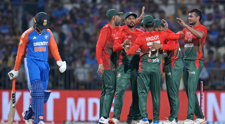 তিন ম্যাচ টি-টোয়েন্টি সিরিজের প্রথমটিতে ভারতের কাছে পাত্তাই পায়নি বাংলাদেশ। পুরো ম্যাচে বাংলাদেশকে শুধু পার্থক্য বুঝিয়েছে সুরিয়াকুমার যাদবের দল। টসে হেরে আগে ব্যাট করতে নেমে শুরুতেই ব্যাটিং বিপর্যয়ে পরে বাংলাদেশ। এরপরের গল্পটা শুধু আসা-যাওয়ার। মাঝে কিছুটা হাল ধরার চেষ্টা করেন নাজমুল হোসেন শান্ত ও মেহেদী হাসান মিরাজ। তবে ব্যাটারদের ব্যর্থতায় ১২৭ রানে গুটিয়ে যায় টাইগাররা। লক্ষ্য তাড়ায় হার্দিক পান্ডিয়া, সুরিয়া এবং সাঞ্জু স্যামসনের ঝড়ে ৪৯ বল বাকি থাকতেই জয়ের বন্দরে পৌঁছে যায় ভারত। ৭ উইকেটের বড় জয়ে ১-০ সিরিজে এগিয়ে গেল ভারত।