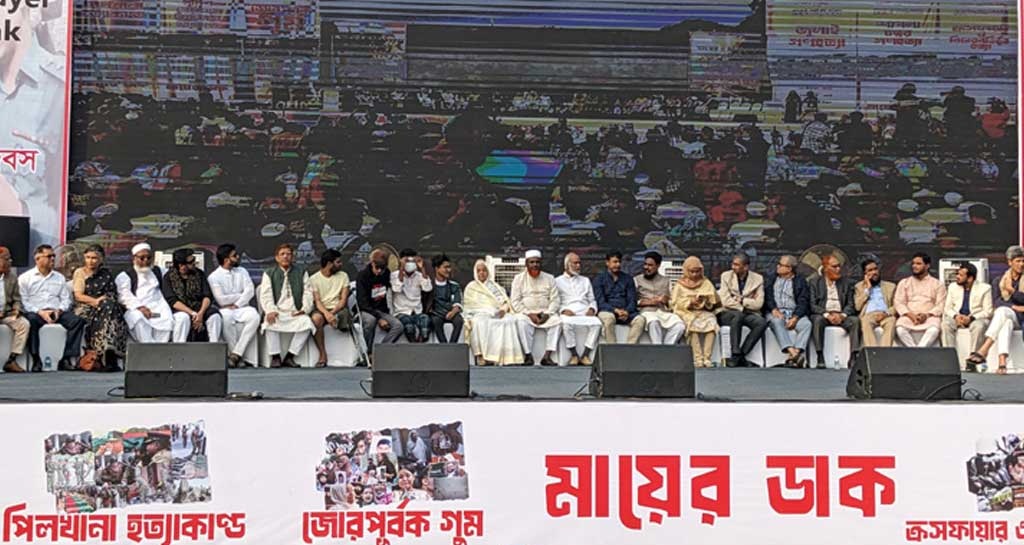 মঙ্গলবার (১০ ডিসেম্বর) জাতীয় মানবাধিকার দিবস উপলক্ষে রাজধানীর সোহরাওয়ার্দী উদ্যানে আয়োজিত ‘আওয়ামী ফ্যাসিবাদী জুলুমের ভুক্তভোগী গণজমায়েত’ শীর্ষক অনুষ্ঠানে বক্তারা এসব কথা বলেন। গুম হওয়া ব্যক্তিদের পরিবারের সদস্যদের নিয়ে গঠিত সংগঠন ‘মায়ের ডাক’ গণজমায়েতের আয়োজন করে।