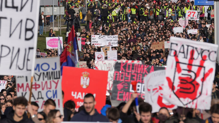 গত নভেম্বরে শহরের একটি রেলস্টেশনের ছাদ ধসে ১৫ জন নিহত হবার ঘটনায় সার্বিয়া জুড়ে এক বিশাল এবং টেকসই বিক্ষোভের সূত্রপাত করে ছাত্র-জনতা। ছবি: বিবিসি নিউজ।