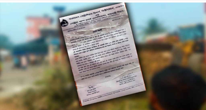 জরুরি বিজ্ঞপ্তিতে জানানো হয়, ৪ ফেব্রুয়ারি নওগাঁ জেলার সড়ক ও জনপথ বিভাগ কোনো প্রকার পূর্বঘোষণা, নোটিশ বা আনুষ্ঠানিক চিঠি প্রদান না করে আকস্মিক উচ্ছেদ অভিযান পরিচালনা করেছে। এই অযৌক্তিক ও অন্যায় অভিযানের ফলে পেট্রোল পাম্প মালিকগণ চরম হতাশ ও ক্ষুব্ধ। আমরা এই অভিযানের তীব্র নিন্দা ও প্রতিবাদ জানাই।
