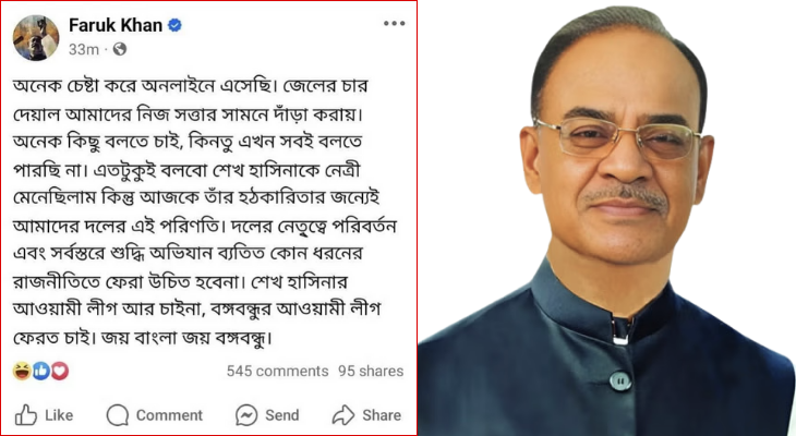 ফারুক খানের ভেরিফায়েড ফেসবুক অ্যাকাউন্টে তিনি লিখেছেন, ‘অনেক চেষ্টা করে অনলাইনে এসেছি। জেলের চার দেয়াল আমাদের নিজ সত্তার সামনে দাঁড়া করায়। অনেক কিছু বলতে চাই, কিন্তু এখন সবই বলতে পারছি না। এতটুকুই বলবো, শেখ হাসিনাকে নেত্রী মেনেছিলাম, কিন্তু আজকে তার হঠকারীতার জন্যই আমাদের দলের এই পরিণতি। দলের নেতৃত্বে পরিবর্তন এবং সর্বস্তরে শুদ্ধি অভিযান ব্যতীত কোনও ধরনের রাজনীতিতে ফেরা উচিত হবে না। শেখ হাসিনার আওয়ামী লীগ আর চাই না। বঙ্গবন্ধুর আওয়ামী লীগ ফেরত চাই। জয় বাংলা জয় বঙ্গবন্ধু।’