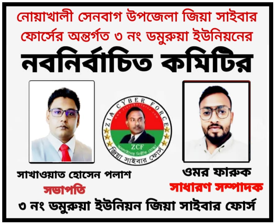 জাতীয়তাবাদী চেতনায় উজ্জীবিত তরুণদের সংগঠন *জিয়া সাইবার ফোর্স সেনবাগ উপজেলার* অন্তর্গত *৩ নং ডমুরুয়া ইউনিয়ন শাখার* ২৬ সদস্য বিশিষ্ট *আংশিক কমিটি গঠন* করা হয়েছে।
