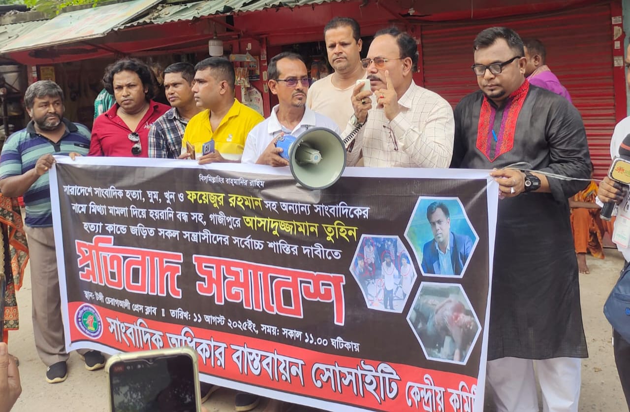 গাজীপুরের টঙ্গী পূর্ব থানার সামনে সাংবাদিক আসাদুজ্জামান তুহিন হত্যাকাণ্ডসহ সারাদেশে সাংবাদিক হত্যা, গুম, খুন ও নির্যাতনের প্রতিবাদে মানববন্ধন ও প্রতিবাদ সমাবেশ অনুষ্ঠিত হয়েছে। একই সঙ্গে সাংবাদিকদের নামে হয়রানিমূলক মিথ্যা মামলা বন্ধেরও দাবি জানিয়েছেন বক্তারা।