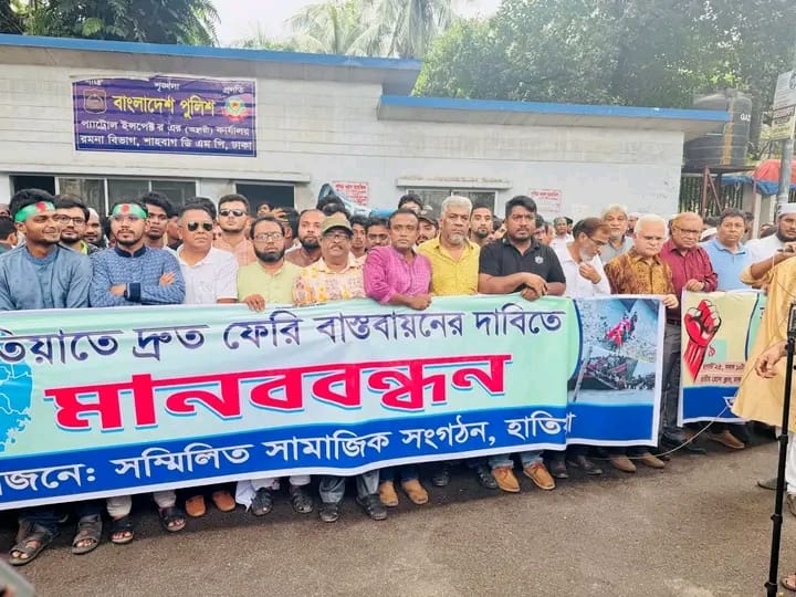 নোয়াখালীর দ্বীপ উপজেলা হাতিয়ার স্থায়ী ফেরি সার্ভিস চালুর দাবিতে রাজধানীর জাতীয় প্রেসক্লাবের সামনে মানববন্ধন অনুষ্ঠিত হয়েছে। “সম্মিলিত সামাজিক সংগঠন” এর ব্যানারে আয়োজিত এই কর্মসূচিতে অংশ নেন হাতিয়ার বিভিন্ন সামাজিক, সাংস্কৃতিক ও পেশাজীবী সংগঠনের নেতাকর্মী ও ঢাকায় বসবাসরত দ্বীপবাসীরা।