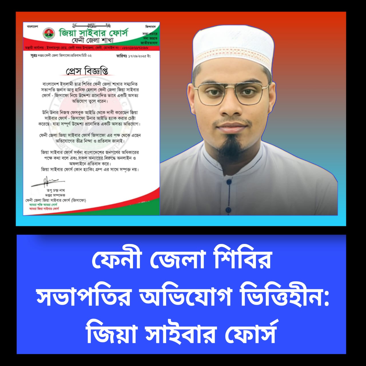 বাংলাদেশ ইসলামী ছাত্রশিবির ফেনী জেলা শাখার সভাপতি আবু হানিফ কর্তৃক জিয়া সাইবার ফোর্সের বিরুদ্ধে আনা অভিযোগকে মিথ্যা, উদ্দেশ্যমূলক ও অসত্য আখ্যা দিয়ে প্রতিবাদ জানিয়েছে ফেনী জেলা জিয়া সাইবার ফোর্স।