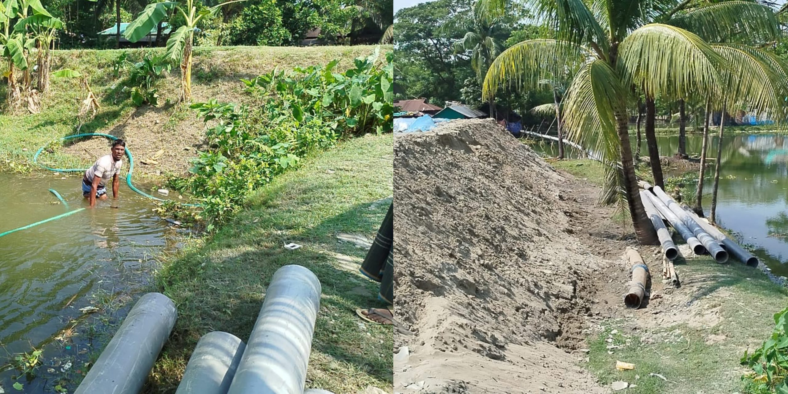 স্থানীয় সূত্রে জানা যায়, একদল অসাধু বালু ব্যবসায়ী রাতে বেড়িবাঁধ কেটে পাইপ স্থাপনের মাধ্যমে পানি নিষ্কাশনের চেষ্টা চালাচ্ছিল। বিষয়টি টের পেয়ে স্থানীয়রা দ্রুত ঘটনাস্থলে পৌঁছে তাদের কাজ বন্ধ করে দেয় এবং ব্যবহৃত সরঞ্জাম জব্দ করে স্থানীয় চেয়ারম্যান ঘাট পুলিশ ফাঁড়িতে জমা দেন।