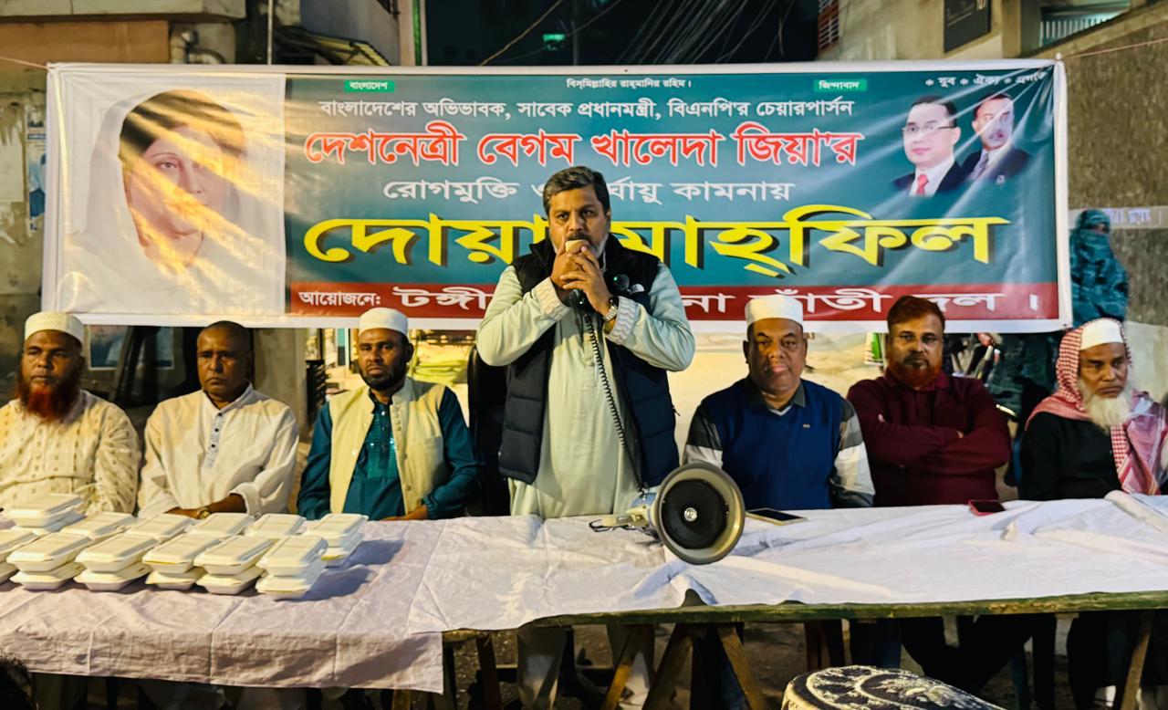 সাবেক প্রধানমন্ত্রী ও বিএনপির চেয়ারপার্সন দেশনেত্রী বেগম খালেদা জিয়ার সুস্থতা কামনায় টঙ্গী পূর্ব থানা তাঁতীদলের উদ্যোগে দোয়া মাহফিল ও তবারক বিতরণ অনুষ্ঠিত হয়েছে। শনিবার সন্ধ্যায় ৪৮নং ওয়ার্ডের জহির মার্কেট এলাকায় এ আয়োজন অনুষ্ঠিত হয়।