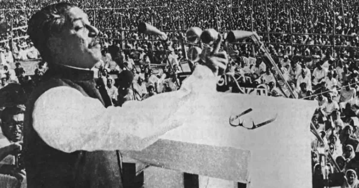 সেদিন বিকেল ৩টা ২০ মিনিটে সাদা পায়জামা-পাঞ্জাবি আর হাতাকাটা কালো কোট পরে বঙ্গবন্ধু দৃপ্ত পায়ে উঠে এলেন মঞ্চে। দাঁড়ালেন মাইকে সামনে। আকাশ-কাঁপানো স্লোগান আর মুহুর্মুহু করতালির মধ্যে হাত নেড়ে অভিনন্দন জানালেন অপেক্ষমাণ জনসমুদ্রের উদ্দেশে। তার পর শুরু করলেন তাঁর ঐতিহাসিক ভাষণ।