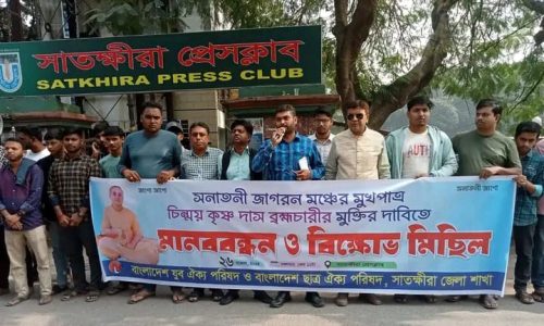 চিন্ময় কৃষ্ণ দাশকে গ্রেফতারের প্রতিবাদে সাতক্ষীরায় মানববন্ধন