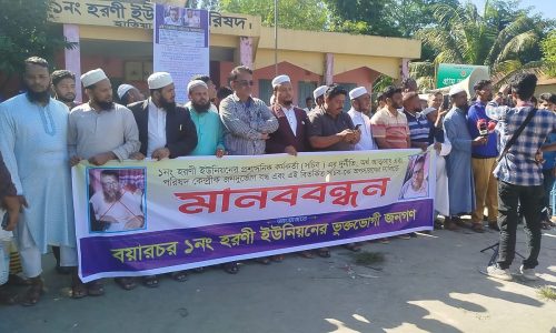হাতিয়া হরণী ইউনিয়ন পরিষদ সচিব এর দুর্নীতির অভিযোগে অপসারণ দাবিতে মানববন্ধন